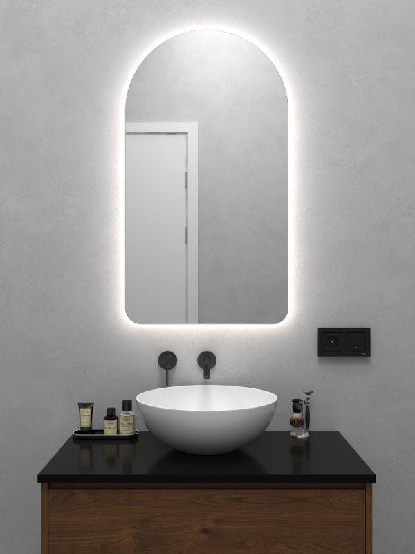 Безрамное зеркало арочной формы с контурной (тыльной) нейтральной подсветкой, свет 4000К. Подложка из высококачественного МДФ, светодиодная лента защищена матовым свето-рассеивателем от попадания пыли и влаги. Есть вывод 220W для подключения к сети, включение подсветки от выключателя на стене, либо от розетки.